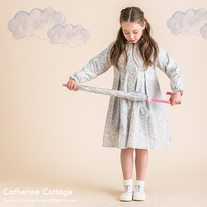 ふわっとしたシルエットがかわいいポンチョも、キャサリン自慢のキュートな小花柄で! フード部分にあしらったビビッドカラーのラインがワンポイントアクセントになっています。雨でも一人で歩きたがるお子さまのサイズ(90cm)からご用意。リュックやランドセルなどを背負ったままでもかぶれます。レジャーのお供にもひとつあると安心!