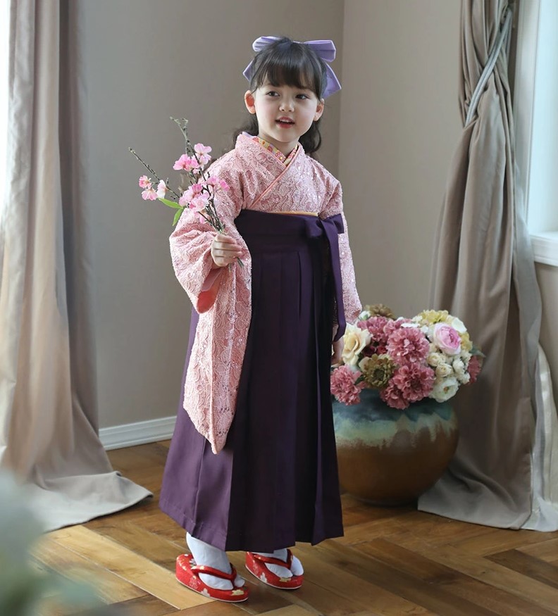 卒園式や卒業式、晴れの日彩る袴スタイルだって、絶対ピンク! レース袴3色のなかでもピンクはとくに、スパンコールがちりばめられた生地を使っているので、ドレスライクな華やかさ