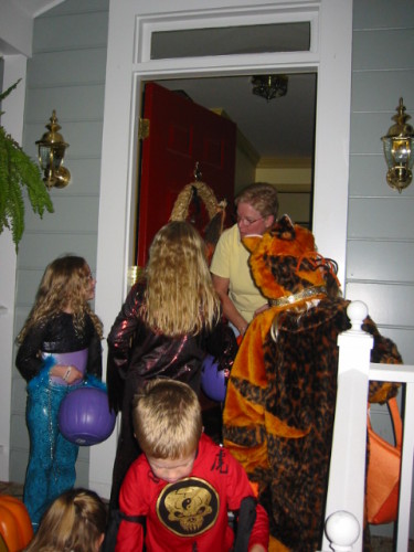 仮装した子どもたちが隣家の玄関の前に立ち「Trick or Treat!」というと、近所の人が玄関をあけて、お菓子をくれるという習慣。